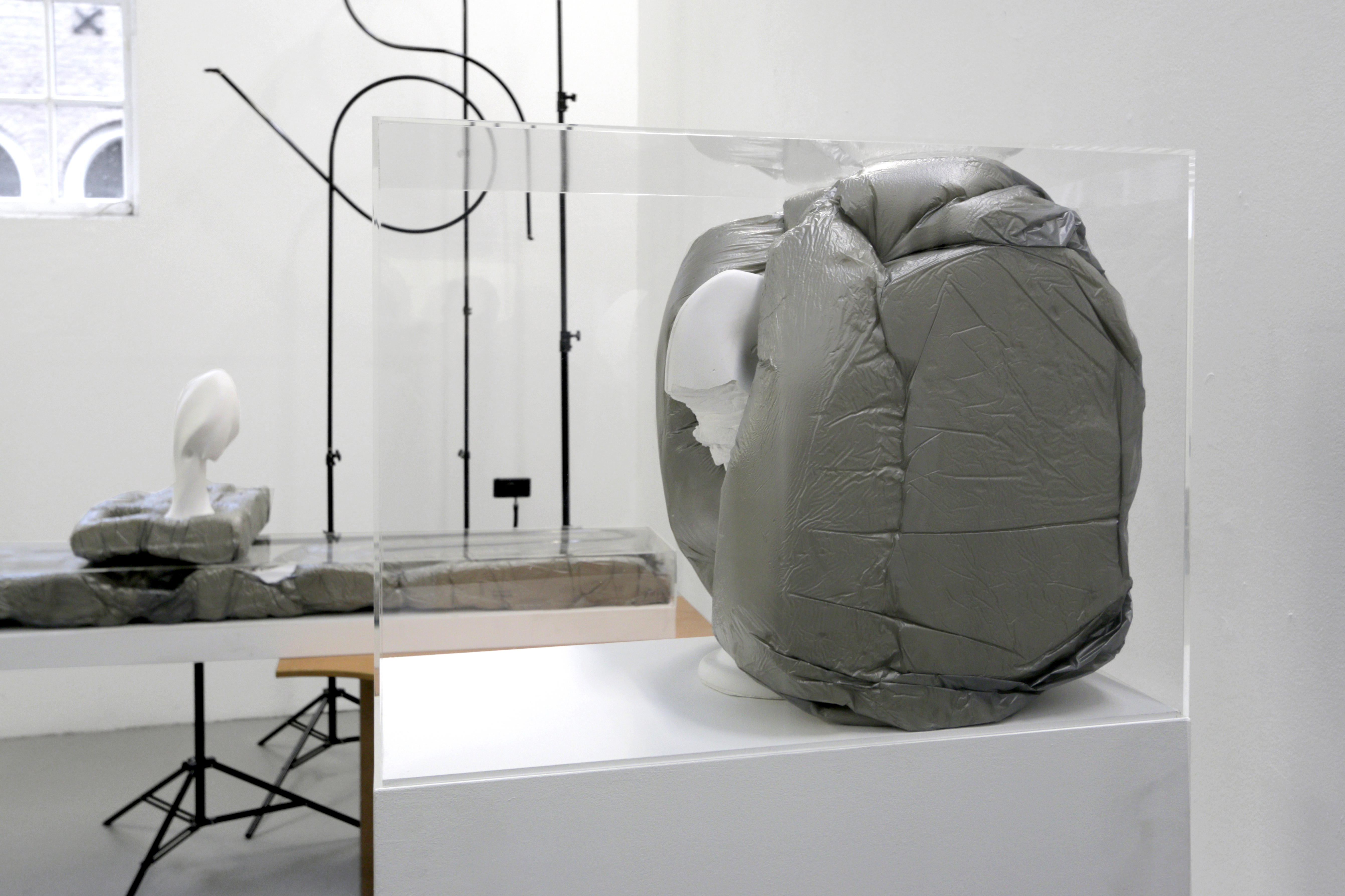 (Aluminum pipe, resin, tripod stands, plaster, Instapak®, second hand display furniture, acrylic sheet, photos, cup, box, vase, rug, stickers, gloves, wooden cameras, wooden cat, tea)