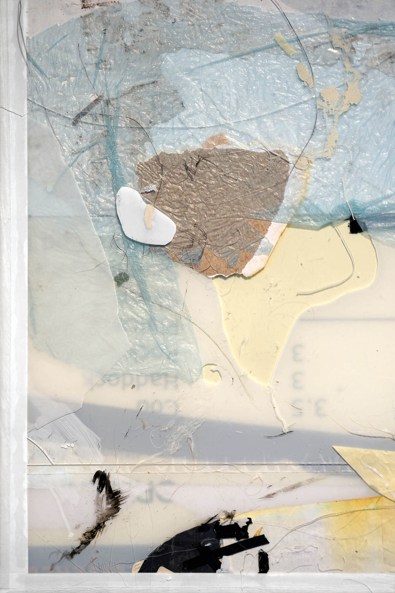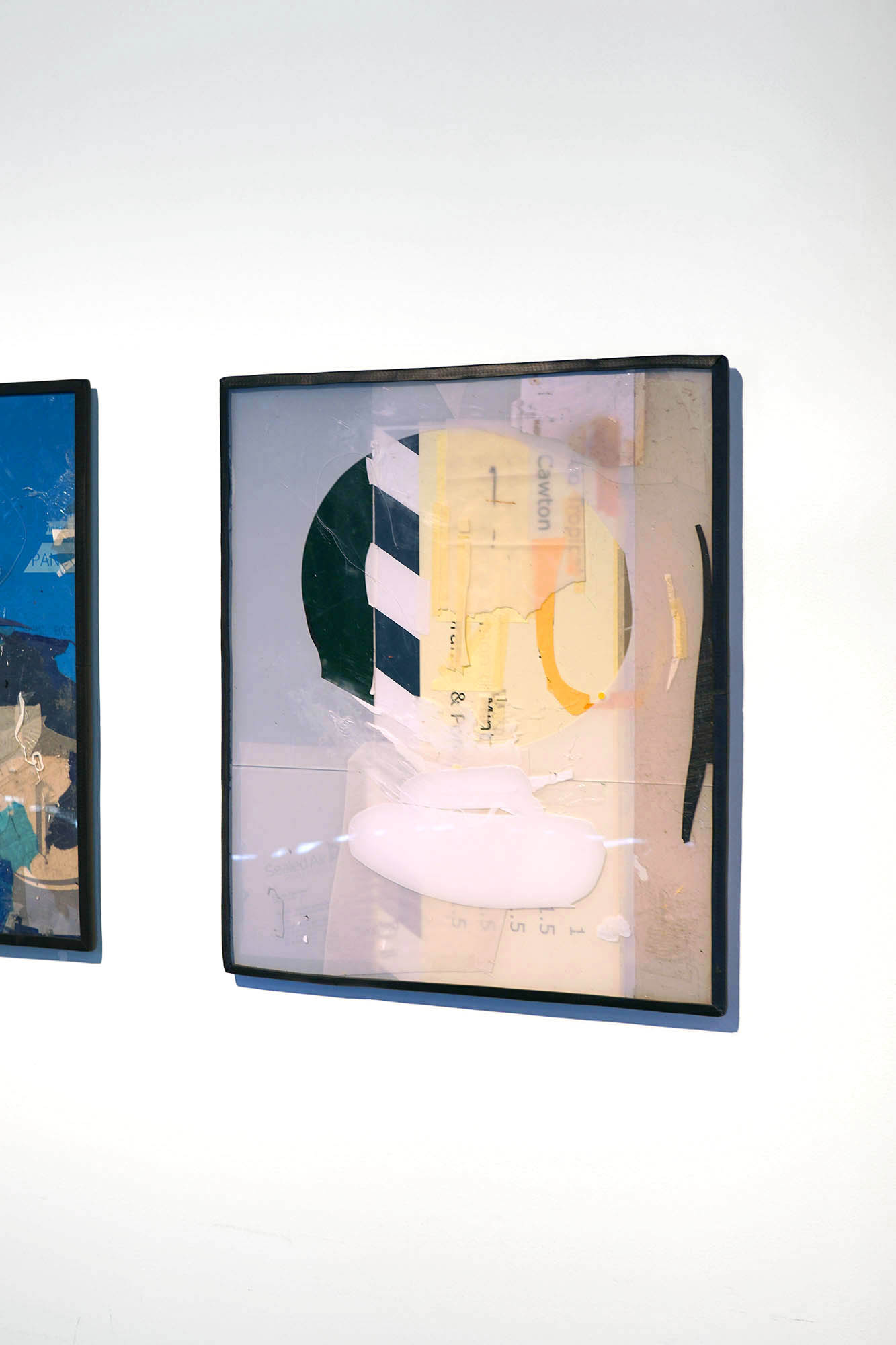 These collages compile reclaimed display materials, gathered from cornershops and local food venues around London's Ridley Road Market. The layers of used acrylic, handwritten signage, print outs and packaging form a ply of ‘public glass’, drawing tender and abstract portraits of the socially significant spaces they stem from.